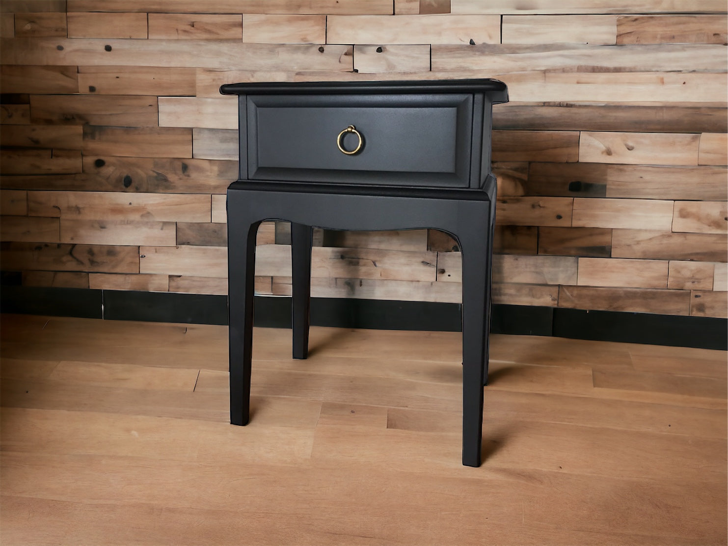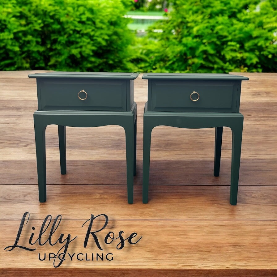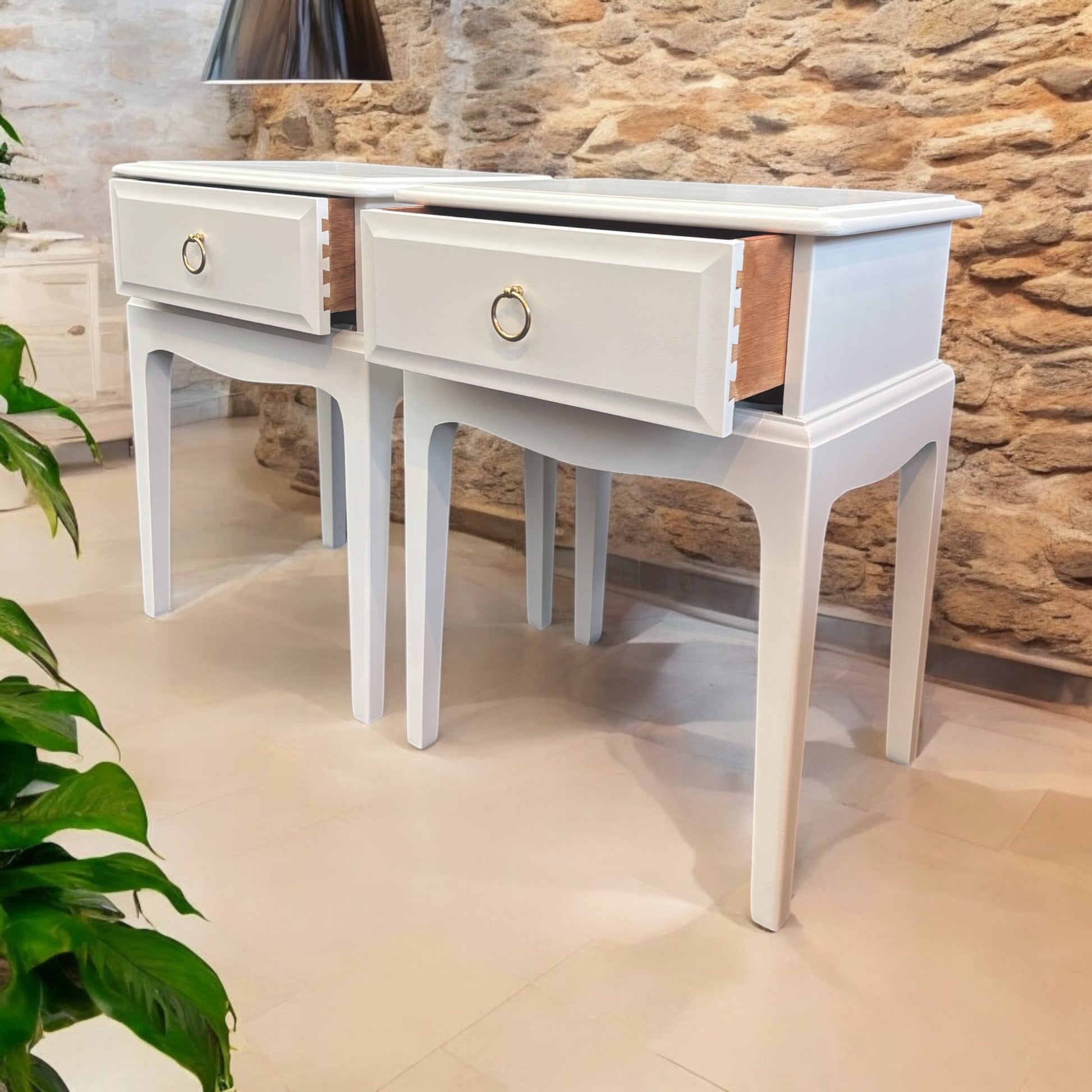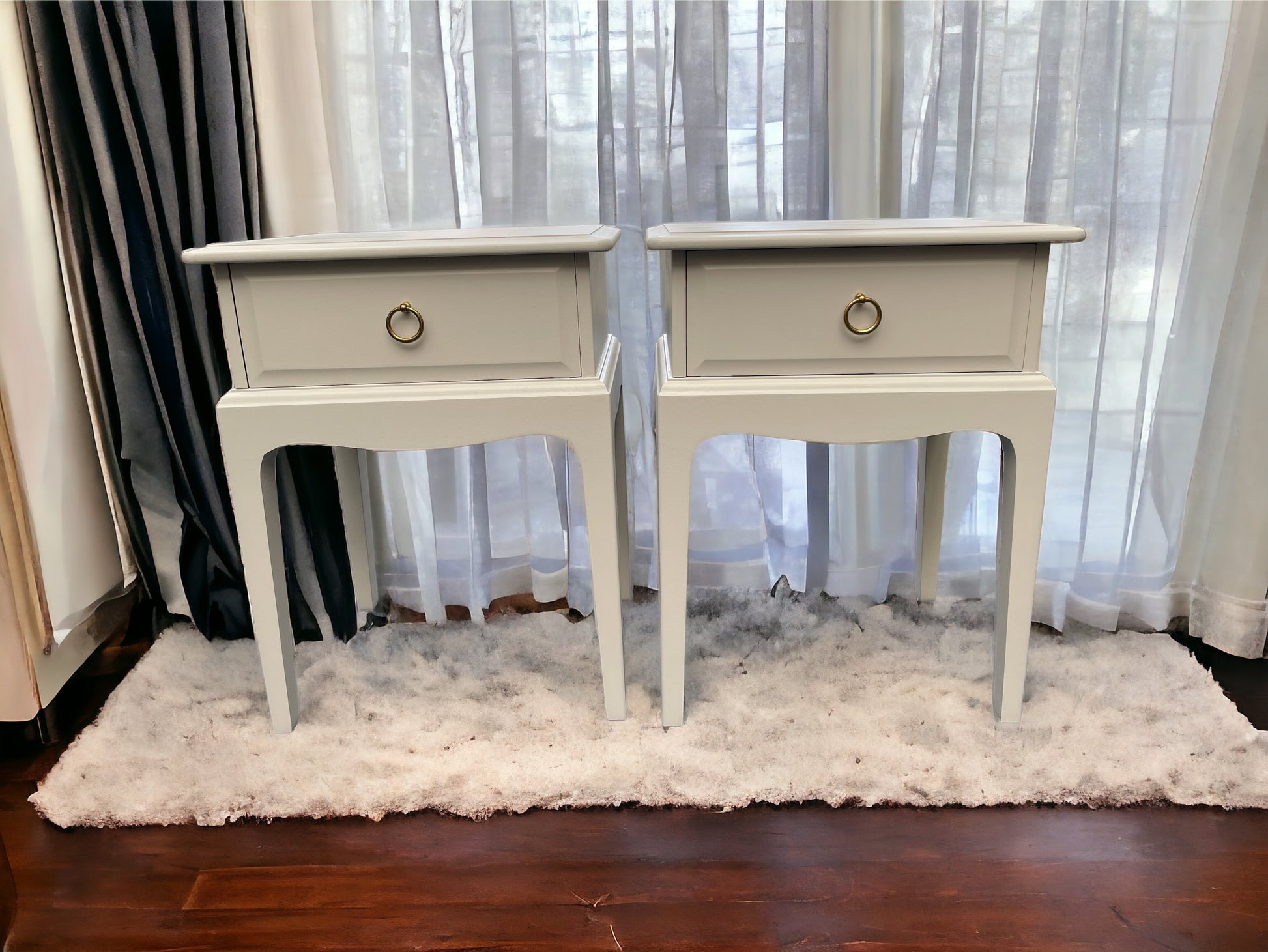 Vintage 1970s/1980s newly refinished Stag Minstrel pair of one drawer leggy bedsides available for refinishing in your choice of colour. Matching furniture also available.