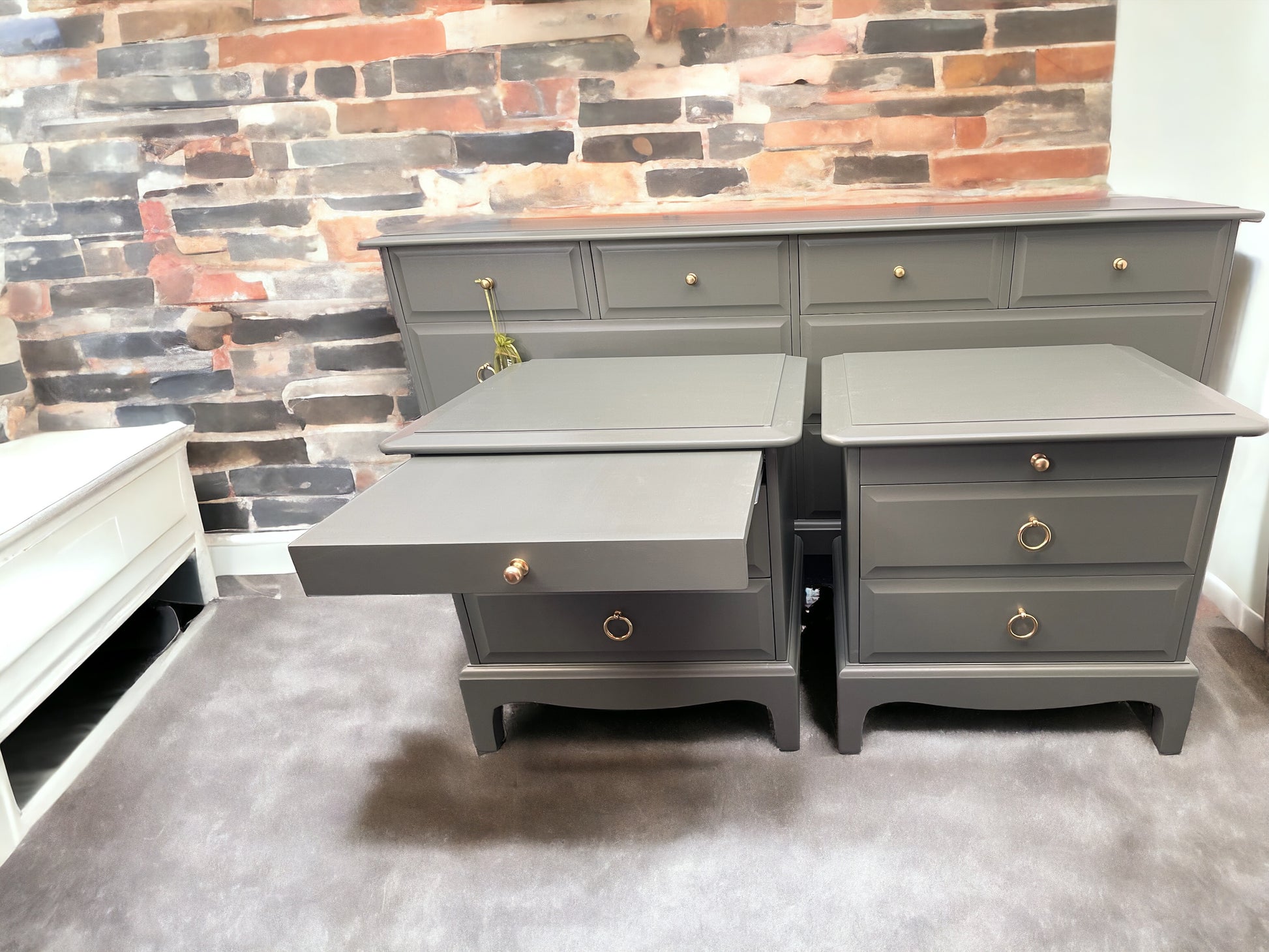 Vintage 1970s/1980s Newly refurbished Stag Minstrel pair of 2 drawer bedside drawers with tea tray available for refinishing in your choice of colour. Matching furniture also available.